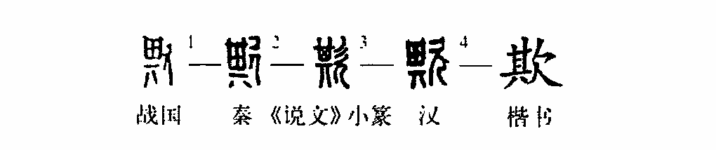“貪財冒賄,欺罔視聽(tīng)?!边@個(gè)“欺”字本為形聲字。①是金文的形體。左邊為“其'表聲;右邊是“言”,表形。②是小篆的形體。③是小篆的異體字?!把浴迸c“人”有關(guān),“欠”本為“人”形,所以小篆即以“欠”代替了金文中的“言”,其義未變。本為以言騙人,后又以人行騙。④是楷書(shū)的寫(xiě)法。