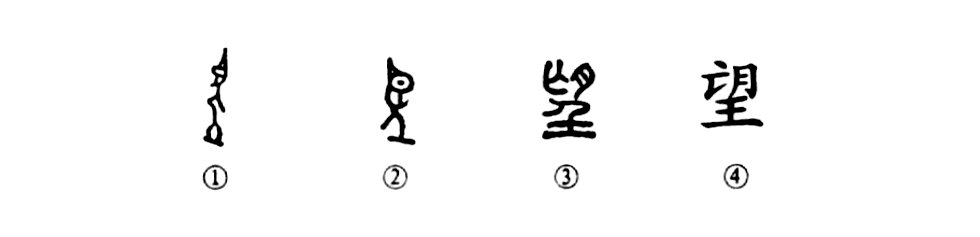 這是“登高而遠望”的“望”字,本為會(huì )意字。①是甲骨文的形體,上部是一只大眼睛,下部是一個(gè)人面朝左站在一個(gè)土堆上,表示登高而遠望。②是金文的形體,與甲骨文相似。③是小篆的形體,左上角增加了表聲的“亡”,右上角為“月”,下部仍為“人”形,表示望月之意。④為楷書(shū)的寫(xiě)法。