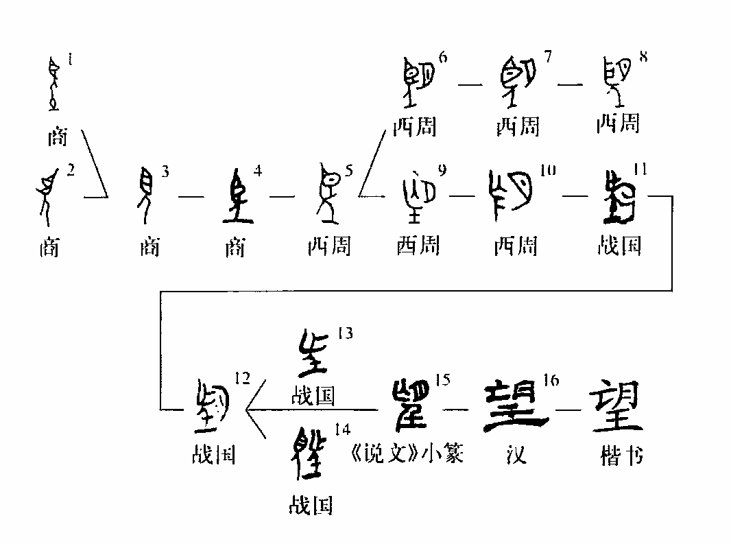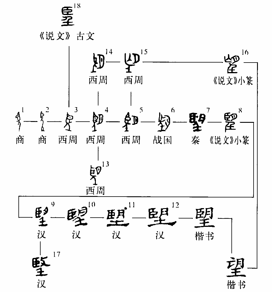 初文像一人站立地上張大其目或向前方或向后方遠望之形。到了西周,語(yǔ)言中有了朔朢之“朢”一詞。遂假其為聲,以月為意符,造為“朢”字以表之,同時(shí)也用以兼表張望、遠望之望。后來(lái)“朢”的形體中像目的部分出現一種訛近“亡”的寫(xiě)法,如字形14,便干脆將這部分寫(xiě)作“亡”,如字形15,以之提示字的讀音,因而又有了“望”字,成為“朢”的異體。再到后來(lái),人們又采用異體字分工方式,以“望”字專(zhuān)門(mén)表示張望、瞭望、遠望之望。而以“朢”字專(zhuān)門(mén)表示朔朢之朢。《說(shuō)文》:“朢,月滿(mǎn)與日相朢。”所釋即是“朢”的本義。漢字簡(jiǎn)化,朔朢之朢、張朢、遠朢、瞭朢之朢統一作“望”。(董蓮池)