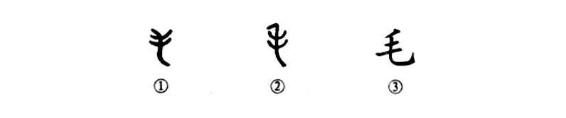 這是“毛”字。從金文①的形體看,就像彎彎曲曲的毛發(fā)之形。小篆②的形體也基本上同于金文。③是楷書(shū)的寫(xiě)法,是由小篆的形體直接演變而來(lái)。