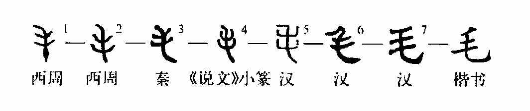 如毛,民鮮克舉之。”可見(jiàn)獸毛之義當是毛字的初義和常見(jiàn)義?!墩f(shuō)文》小篆毛字形體是直接承襲西周金文、秦代毛字形體而來(lái)。漢代初年馬王堆漢墓帛書(shū)的毛字形體是從篆文向東漢時(shí)代成熟隸書(shū)以及后代楷書(shū)毛字形體的過(guò)渡形式。(周寶宏)