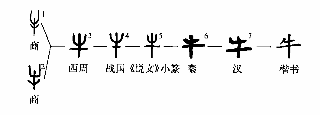 “橫眉冷對千夫指,俯首甘為孺子牛?!边@個(gè)“?!弊质莻€(gè)象形字。甲骨文①是正面看牛頭的形象,兩側向上彎的部分是一雙牛角,牛角之下向斜上方伸展的兩筆是牛的一雙耳朵。金文②的形體也基本上同于甲骨文,只是將牛耳拉平,成為一條橫線(xiàn)。小篆③與金文的形體相類(lèi)似。④是楷書(shū)寫(xiě)法,根本看不出牛頭之形了。