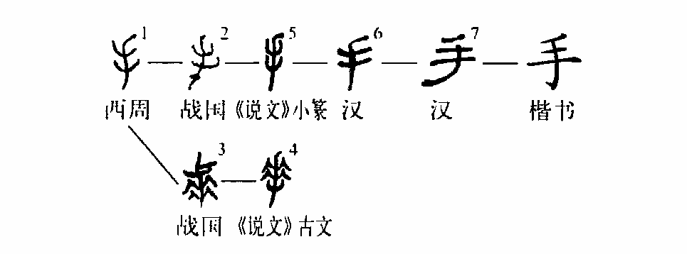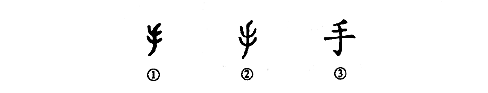“娥娥紅粉妝,纖纖出素手。”(《古詩(shī)十九首》)這個(gè)“手”字是個(gè)象形字。你看金文①多像一只大手,上部是五個(gè)指頭,下部是手臂。小篆②也很像一只手的形象。③是楷書(shū)的寫(xiě)法,不太像手的樣子了。