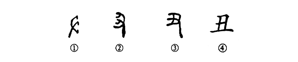 這個(gè)“丑”字本為象形字。①是甲骨文的形體,像留有長(cháng)指甲的一只手形。郭沫若認為,“丑”字“實(shí)象爪之形”。②是金文的形體。與甲骨文極為相似,只是方向相反。③是小篆的寫(xiě)法,上下指甲相延而成一線(xiàn),其義不變。④為楷書(shū)的寫(xiě)法。
