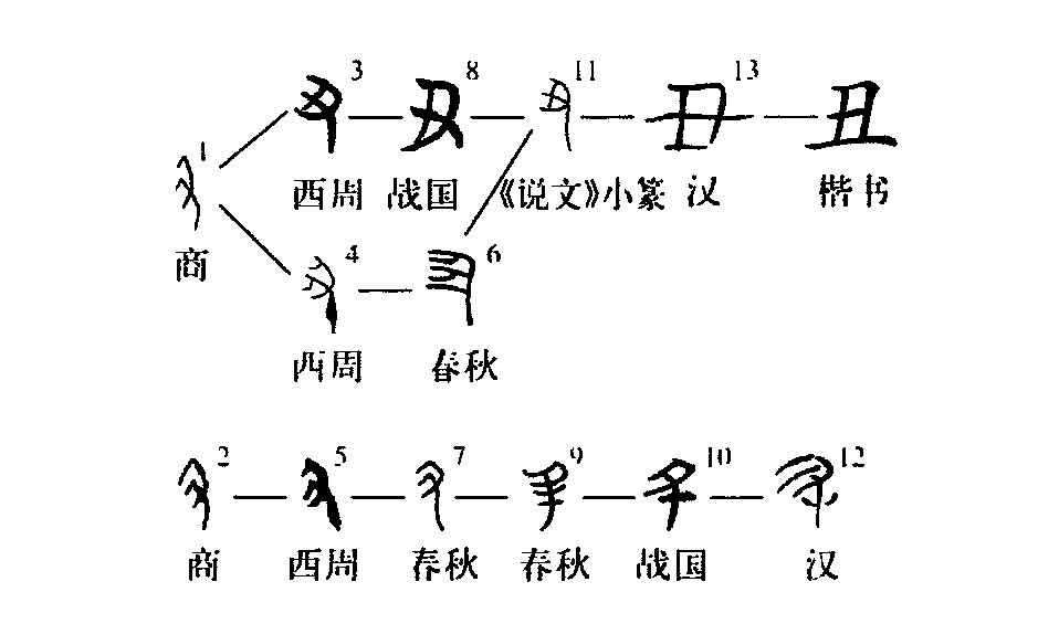 象形字。像手爪之形,假借為地支字,用以紀月,指農歷十二月;用以紀時(shí),指一時(shí)至三時(shí);在太歲紀年法中亦用以紀年,《爾雅·釋天》:“太歲在丑曰赤奮若。”與天干相配,可紀年,亦可紀日?!俺蟆?,又被假借為戲劇角色用字。傳統戲曲角色扮演滑稽可笑的喜劇人物或反面人物的“大花臉”、“三花臉”,稱(chēng)“丑角”。明徐渭《南詞敘錄》:“丑,以粉墨涂面,其形甚醜。今省文作‘丑’。”(李義海)