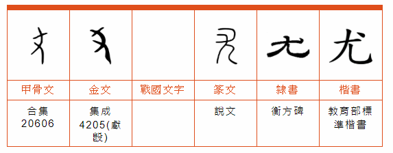 骨文字從又從一、又亦聲。在六書(shū)中屬於形聲。字從一以或示禁止,故產(chǎn)生禍害意。卜辭尤字形不誤,至篆文形訛,《說(shuō)文》誤釋作「從乙、又聲」。隸、楷字形更據篆文有所調整,全失原形。