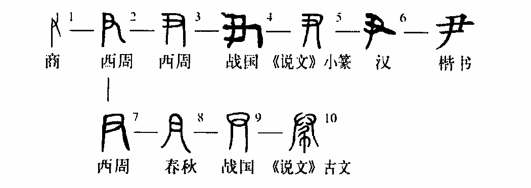 會(huì )意字。像以手持物形。所持物多以為是筆形,即古之“聿”?!耙笔且杂檬殖止P會(huì )治事之義。《說(shuō)文》:“尹,治也。從又、丿,握事者也。”現在人們對“尹”字的認識其實(shí)并沒(méi)有超越許慎多少。說(shuō)所持像筆,也純屬猜測?!耙痹谖墨I中最常用的詞義是治事之職官?!爸巍迸c“治者”是動(dòng)、名相因,不必指定哪個(gè)是本義,凡與文字構形有直接聯(lián)系的意義都可視為本義?!耙弊职l(fā)展到春秋,為了追求字形的對稱(chēng)美觀(guān),左右兩側圓轉對稱(chēng),已看不出以手持物的樣子了?!墩f(shuō)文》古文所從的“尹”更分裂為左右對稱(chēng)的兩只手,其訛變的過(guò)程與“君”字古文所從“尹”完全相同。(李守奎)