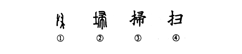 “掃蕩六合清,仍為負霜草?!边@個(gè)“掃”字本為會(huì )意字。甲骨文①的右邊是一把掃把,左邊是一只手,表示掃除塵土。②是小篆的形體,掃把仍在右邊,左邊換成“土”,以帚掃土,仍為掃除意。③為楷書(shū)繁體字,又將“土”換成“手”,為以手持帚掃除之意。④為簡(jiǎn)化字。