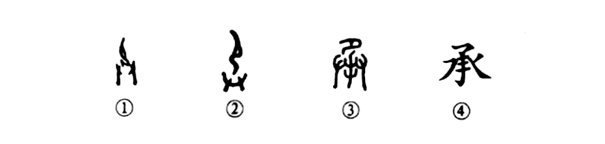 這是個(gè)“承”字。甲骨文①的上部是面朝左半跪著(zhù)的一個(gè)人,人的下面是兩只大手,是“捧著(zhù)”的意思,可見(jiàn)“承”是個(gè)會(huì )意字。金文②也基本上同于甲骨文的形體。小篆③則有所變化,即在金文的兩手之間又增加了一只手。④是楷書(shū)的形體,既看不出“人”,也看不出“手”的模樣了。