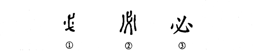 “物類(lèi)之起,必有所始。”這個(gè)“必”字本為象形字。①是金文的形體。其上部的缺口處,可以捆綁斧頭,其下為彎曲的斧柄。②是小篆的形體,根本看不出斧柄的樣子了。③為楷書(shū)寫(xiě)法。