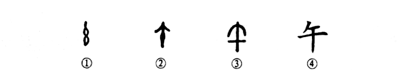 “午”字就是“杵”字的本字,是個(gè)象形字。甲骨文①像兩頭粗圓、中間有一細腰的杵形,可以用來(lái)舂米。②是金文的形體,上端向左右伸展的部分是兩個(gè)把手,供兩個(gè)人使用,抬起落下便于用力。③是小篆的形體,變得不像杵的樣子了。到了楷書(shū)④那就更不像杵形,它是由小篆直接變來(lái)的。