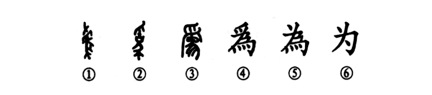 這是“為有犧牲多壯志”的“為”字,是個(gè)會(huì )意字。甲骨文①的上端是一只手,其下是頭朝上尾朝下腹朝右的一頭大象,意思是手拉大象去勞動(dòng)的意思。金文②的上部也是手(爪),其下部的大象變?yōu)楦钩罅?。③是小篆的形體,越變越復雜,僅是上部的手形還有點(diǎn)兒像,下面的大象就不像了。④是復雜的楷書(shū)體,是由小篆直接演變而來(lái)。⑤是簡(jiǎn)化了的楷書(shū)體。⑥是最新簡(jiǎn)化字。