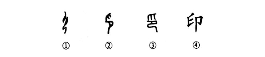 這個(gè)“印”字是個(gè)會(huì )意字。甲骨文①的左上方是一只大手(爪),右邊是面朝左半跪的一個(gè)人,意思是要用手壓服一個(gè)人之形。金文②就更明顯了,上面的大手把下面這個(gè)面朝左的人,按得彎腰曲背,好像在鞠九十度的躬。所以“印”字即“抑”字的本字(“印”與“抑”古聲也通)。小篆③的上部仍為手形(爪),下部的“人”卻錯變?yōu)?ldquo;卩”了??瑫?shū)④將手(爪)變到左邊,“人”(卩)變到右邊,根本看不出用手按人頭之意了。