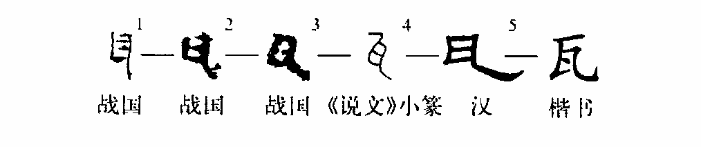 象形字。像兩瓦咬合之形。始見(jiàn)于戰國文字。秦陶文“瓦”字作“