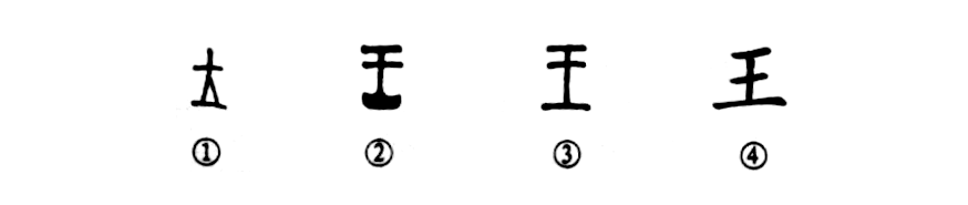 “帝王將相寧有種乎!”這個(gè)“王”字是個(gè)象形字。甲骨文①是個(gè)斧頭之形,下端是斧刃。金文②也基本上同于甲骨文的形體,不過(guò)下端的斧刃更像實(shí)物,如同古代武士所拿的大板斧。小篆③的形體是由全文演變而來(lái)。④是楷書(shū)的寫(xiě)法。