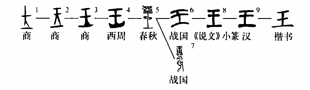 ”,“王”字構形便與我們今天楷書(shū)中的“王”字一樣了。春秋戰國時(shí)期,南方楚國及吳越地區的“王”字上或綴加鳥(niǎo)形,這種書(shū)體過(guò)去稱(chēng)為“鳥(niǎo)蟲(chóng)書(shū)”,所加鳥(niǎo)形乃裝飾性符號,純粹為了美觀(guān),并無(wú)實(shí)在意義。秦代小篆中“王”字和“玉”字的形體十分接近(“玉”字作“王”),但仍有區分,“王”字中間一橫略微靠上,“玉”字則中間一橫處于正中位置,參“玉“字條。(白于藍)