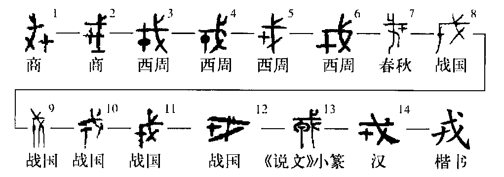 會(huì )意字。從戈、從甲,會(huì )兵甲之意。古文字“戎”字從戈、從
