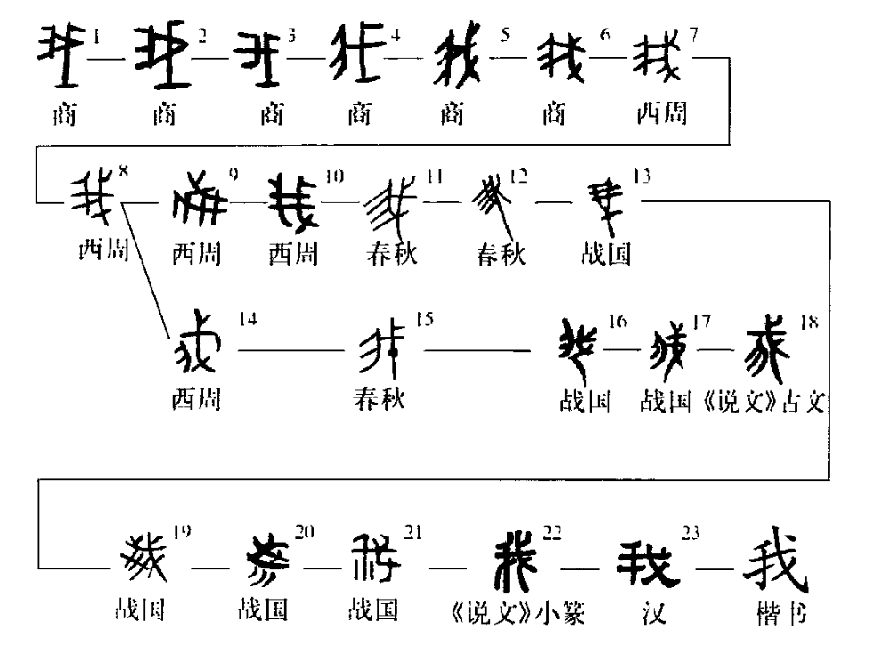 象形字。甲骨文“我”像刃部有齒的一種特殊的斧鉞形武器。文獻作“锜”。《詩(shī)·豳風(fēng)·破斧》:“既破我斧,又缺我锜。”西周金文承襲甲骨文,形體略有變化。春秋金文“我”字或作