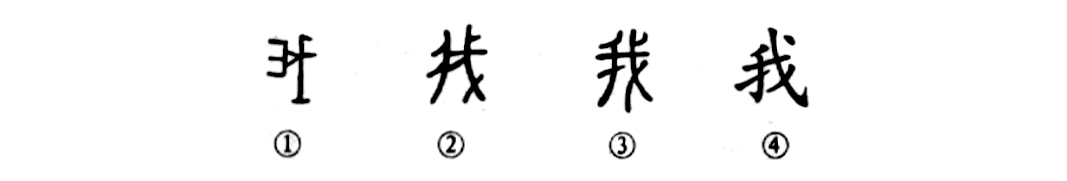 現在的“我”字是第一人稱(chēng)代詞??墒撬脑剂x卻是一種像鋸齒似的鋒利兵器,原是個(gè)象形字。甲骨文①的上部朝左部分是三鋒戈,中間是一條長(cháng)柄。金文②與甲骨文有點(diǎn)相似,右邊也清楚地看出為“戈”形。小篆③則不太像兵器的形象。④是楷書(shū)的形體。