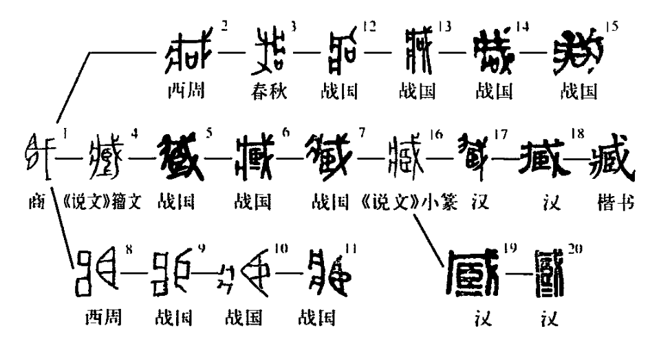 字上又加形旁攴(蓋取意于對臧獲可任意鞭撻)。作為小篆正體的從臣戕聲的臧字是這時(shí)出現的,即《說(shuō)文》籀文。其所以不用口、攴而以臣為形旁,可能受到甲骨文會(huì )意字??的影響,甚至可以說(shuō)是以爿或戕對??的聲化改造。籀文臧字臣下的