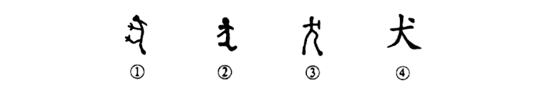 “犬守夜,雞司晨。”“犬”就是狗。甲骨文①是一只頭朝上、尾朝下、腿朝左的狗。金文②就更像狗的樣子了,頭上左右兩側是兩只耳朵,下部的尾巴向右上卷起。小篆③則不像狗的樣子了。④是楷書(shū)的寫(xiě)法,“大”字加一點(diǎn),完全失去了狗的形象。