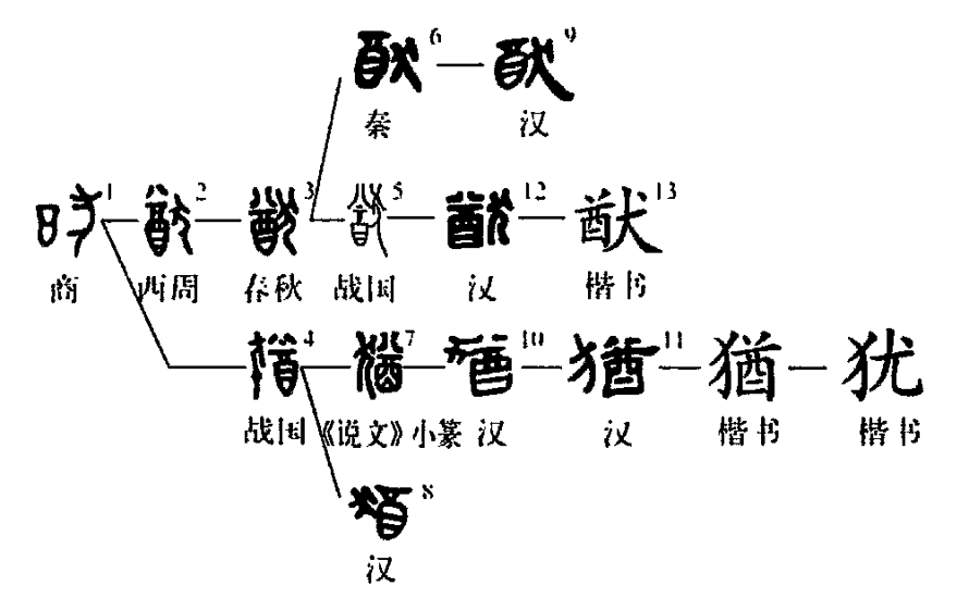 形聲字。從犬,酋聲。本義為猴類(lèi)動(dòng)物。《說(shuō)文》:“猶,玃屬。”《爾雅·釋獸》:“猶如麂,善登木。”郝懿行義疏:“猶之為獸,既是猴屬,又類(lèi)麂形。麂形似麕而足如狗,故猶從犬矣。”也叫“猶猢”,《水經(jīng)注·江水》:“山多猶猢,似猴而短足,好游巖樹(shù)。”因同音的關(guān)系,“猶”的字形被假借來(lái)用作動(dòng)詞、副詞,表示如同、好比、還、仍、尚且等義。甲骨文左為酒壇形的“酉”,右為“犬”;金文酒壇上增加了溢出的酒水形而為“酋”。后字形分化,左“酋”、右“犬”演變成“猷”,義為謀略、計劃。西周中期史墻盤(pán):“遠猷腹心。”左“犬”、右“酋”演變成“猶”?,F代漢字簡(jiǎn)化時(shí),根據唐代敦煌變文寫(xiě)本及元抄本中出現過(guò)的字形,將“猶”簡(jiǎn)作“猶”。(郭小武 葉青)