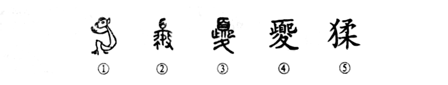 這個(gè)“猱”字讀作náo,本為象形字。①是甲骨文的形體,是猿類(lèi)動(dòng)物,身體便捷,善于攀援。②是金文的形體,變得不像了。③是小篆的寫(xiě)法。④為楷書(shū)的寫(xiě)法。⑤為后世通行楷書(shū)體,變象形為形聲。