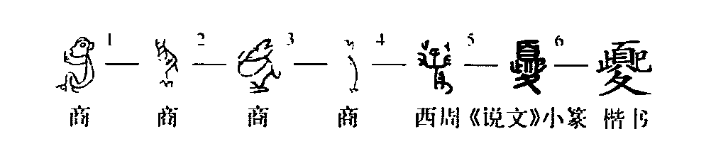 象形字。像獼猴形。《說(shuō)文》訓夒為“貪獸也。一曰母猴”。母猴亦作獼猴解,因為象形字有局限,無(wú)法表示其性別。在商代甲骨文中,夒有勾勒形與單純線(xiàn)條形之別。甲骨文夒為側立之形,除表現獼猴頭部有耳、目、口,身體上有又(手)、下有止(足)之外,還著(zhù)意表示有尾之形。偶或省略尾形,字亦可識,但不屬于標準寫(xiě)法。周代夒字寫(xiě)法出現繁復變化。甲骨文夒用做高祖名,學(xué)者多以為指帝嚳。西周金文夒或假為擾,
