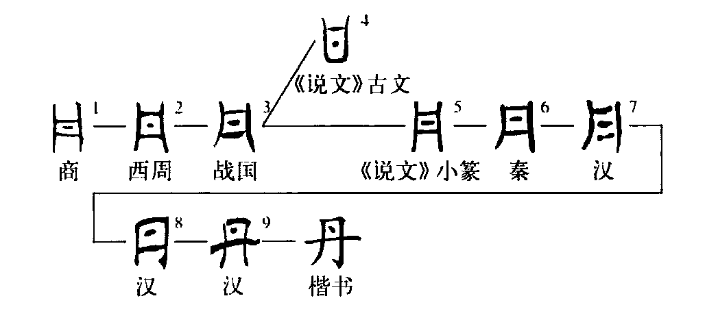” (《說(shuō)文》古文與此形顛倒相對,變化道理近似,只是變化在底部),原來(lái)居下位的長(cháng)橫又向兩邊延伸,穿透左右豎線(xiàn),全字演變成“丹”形??瑫?shū)把內部短畫(huà)或橫點(diǎn)變作斜點(diǎn)。《說(shuō)文》:“丹,巴、越之赤石也。”說(shuō)丹是西南地區出產(chǎn)的朱砂。“丹”本義就是朱砂。西周庚嬴卣:“易(賜)貝十朋,又丹一
