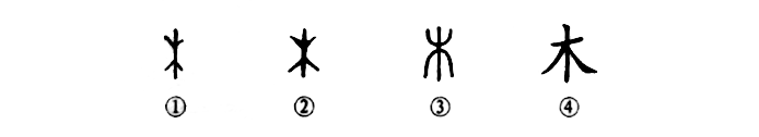 “無(wú)邊落木蕭蕭下,不盡長(cháng)江滾滾來(lái)。”這是“木”字。甲骨文①的形體就是一棵樹(shù)的樣子,上部是樹(shù)頭,下部是樹(shù)根。金文②同于甲骨文。由此可見(jiàn),“木”字就是個(gè)象形字,即像樹(shù)形。小篆③只是甲、金文的直筆變成了曲筆而已。④是楷書(shū)形體,把小篆上部的曲筆變成了一橫,樹(shù)根的部分變成了一撇一捺,這就不太像樹(shù)的樣子了。