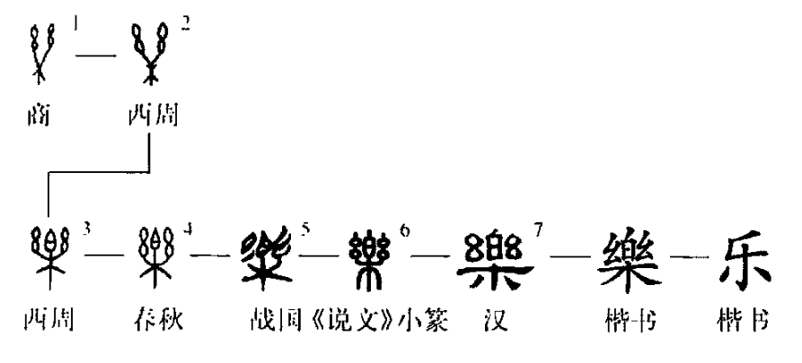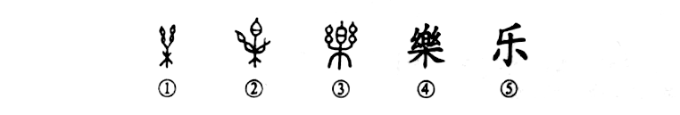 “鐘鼓樂(lè )之。”這個(gè)“樂(lè )(yuè)”字本為象形字。甲骨文①是“弦附木上”的形象,像古代琴的樣子。正如郭沫若先生所說(shuō):“樂(lè )字之本為琴。”②是金文的形體,中間的“白”“乃象調弦之器”。③是小篆的形體,由金文直接演變而來(lái)。④是楷書(shū)繁體字。⑤為簡(jiǎn)化字,是草書(shū)楷化的形體。