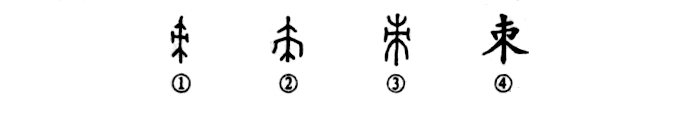 這個(gè)“朿”字讀作cì,本為象形字。甲骨文①就像樹(shù)木上長(cháng)的刺的形象,實(shí)為“刺”的本字。②是金文的形體,與甲骨文相似。③是小篆的寫(xiě)法。④為楷書(shū)的寫(xiě)法,中間并不封口。