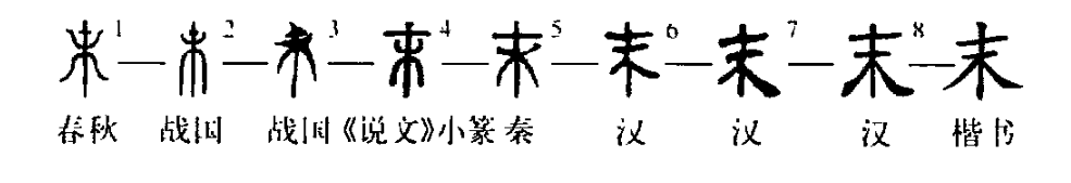 指事字。在“木”字像樹(shù)枝的部分加“-”或“·”,作為指示字義的符號。本義是樹(shù)梢。《說(shuō)文》:“木上曰末。”《左傳·昭公十二年》:“末大必折。”也泛指物體的末梢。《孟子·梁惠王上》:“明足以察秋毫之末。”比喻非根本的、次要的事物,跟“本”相對。《荀子·議兵》:“今女(rǔ)不求之于本而索之于末,此世之所以亂也。”成語(yǔ)有“本末倒置”。又特指工商業(yè),跟“本”(特指農業(yè))相對。漢賈誼《論積貯疏》:“今背本而趨末,食者甚眾,是天下之大殘也。”(冀小軍)
