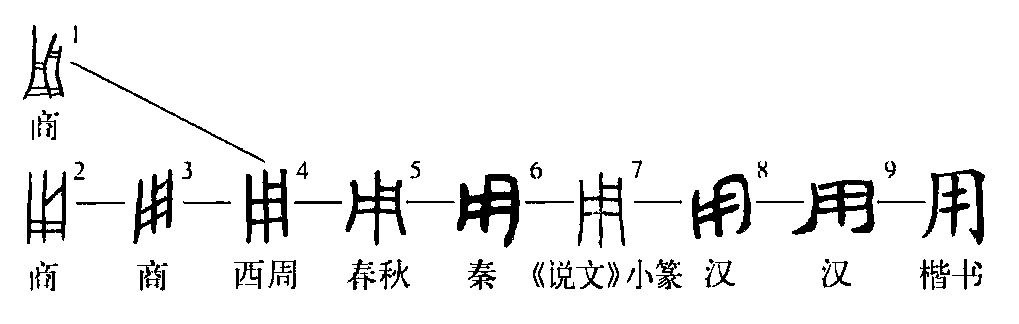 ,與后代小篆相同。春秋戰國雖有變化,但大體不出此框架結構。隸變后楷書(shū)作用,記號字。《說(shuō)文》本義為“可施行”,即施行、行用、使用。“用”與“不用”是甲骨學(xué)術(shù)語(yǔ),出現在命辭之后,表示對命辭內容可施行與否的裁定。《合集》30719:“?(侑)于且乙一牛?用。”《殷契佚存》86:“辛未又(侑)于出日?茲不用。”甲骨文、金文又特指殺牲(含人牲)以祭。《殷虛書(shū)契續編》2.16.3:“三百羌用于丁?”矢方彝:“明公用牲