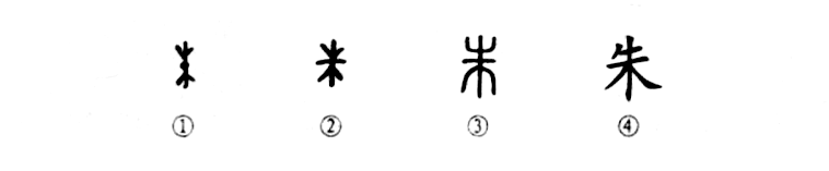 這是“朱門(mén)酒肉臭”的“朱”字,是個(gè)指事字。我們看甲骨文①就是一棵樹(shù)的形象,上為樹(shù)頭,下為樹(shù)根,中間的一個(gè)黑點(diǎn)是表明這棵樹(shù)(木)是紅心的,所以《說(shuō)文》說(shuō):“赤心木,松柏屬。”由此可見(jiàn),“朱”字的本義就是“紅”、“赤"。②是金文的形體,大致與甲骨文相似,只是“木”中的“一點(diǎn)”變成了一橫。小篆③同于金文,只是把樹(shù)頭與樹(shù)根的直筆變成了曲筆??瑫?shū)④又在其左上增加了一撇。