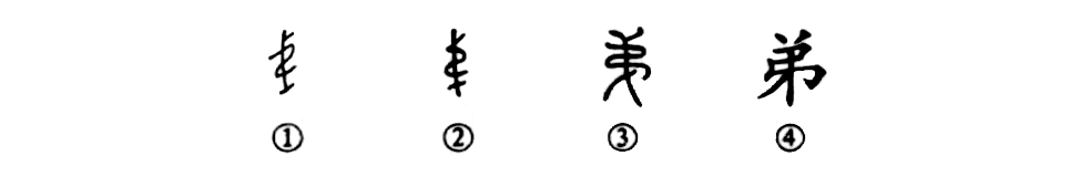 “兄則友,弟則恭。”這個(gè)“弟”字本為象形字。甲骨文①的中間是上下直立的“弋”,是長(cháng)木橛的形狀,中間纏上繩索。商承祚先生認為,這就是“梯”字的初文。②是金文的形體,與甲骨文相似。③是小篆的形體。④為楷書(shū)的寫(xiě)法。