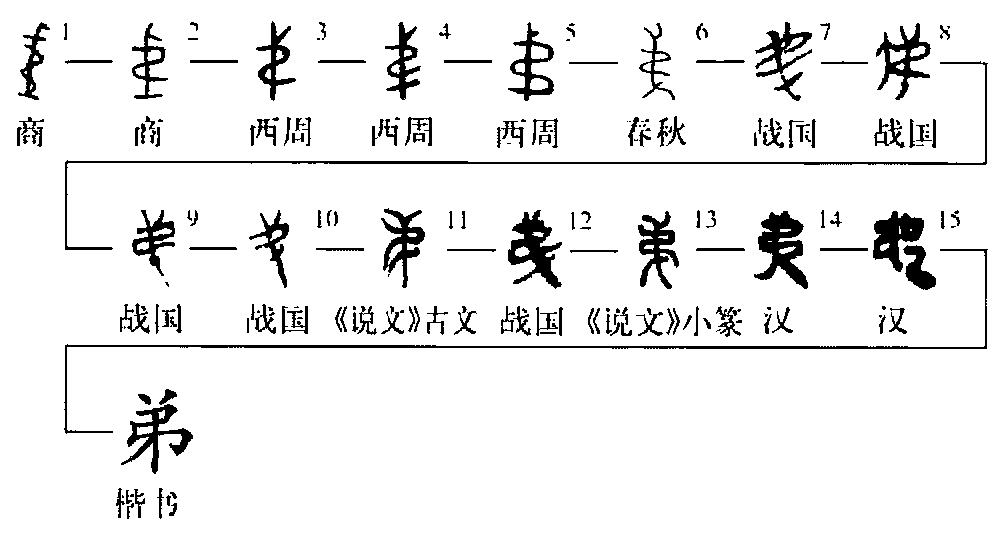 (必)、從己,像柲纏韋形,《說(shuō)文》以為“韋束之次弟也”。戰國文字字形相沿襲,亦有一些變化,主要是柲形變直豎為向右(偶向左)的斜畫(huà),隨之下端的一橫也變成一撇;亦有不作一撇而作圓點(diǎn)的。纏韋形亦有簡(jiǎn)化。秦小篆、漢隸的寫(xiě)法都受戰國文字的影響。弟古多用為兄弟之弟。《包山楚簡(jiǎn)》151:“步死,無(wú)子,其弟番