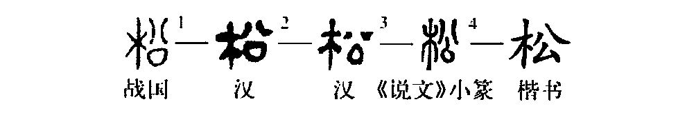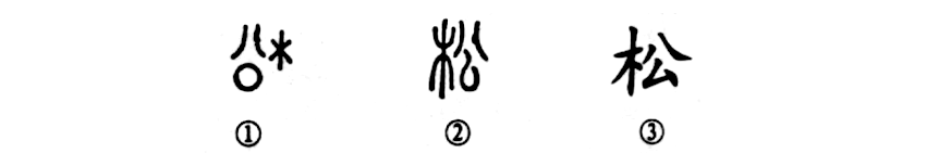 ?“下簾危坐聽(tīng)松濤。”這個(gè)“松”字是形聲字。①是金文的形體。左邊是“公”表聲;右邊為“木”,表形。②是小篆的形體,將金文的“公”與“木”的位置對換過(guò)來(lái)。③是楷書(shū)的寫(xiě)法。