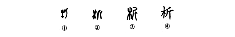 這個(gè)“析”字是個(gè)會(huì )意字。你看甲骨文①的形體,其左邊就是一棵樹(shù)(木),右邊是一把平刃曲柄的大斧頭(錛屬),是用斧砍樹(shù)(木)的意思。②是金文的寫(xiě)法,其左邊仍是木,右邊的大斧頭變?yōu)?ldquo;斤”形,不太像斧頭的樣子了。小篆③是直接由金文蛻變而來(lái),形體基本相似,只是把直筆變?yōu)榍P罷了。④是楷書(shū)的寫(xiě)法,也是從“木”從“斤”,沒(méi)有發(fā)生過(guò)偽變。