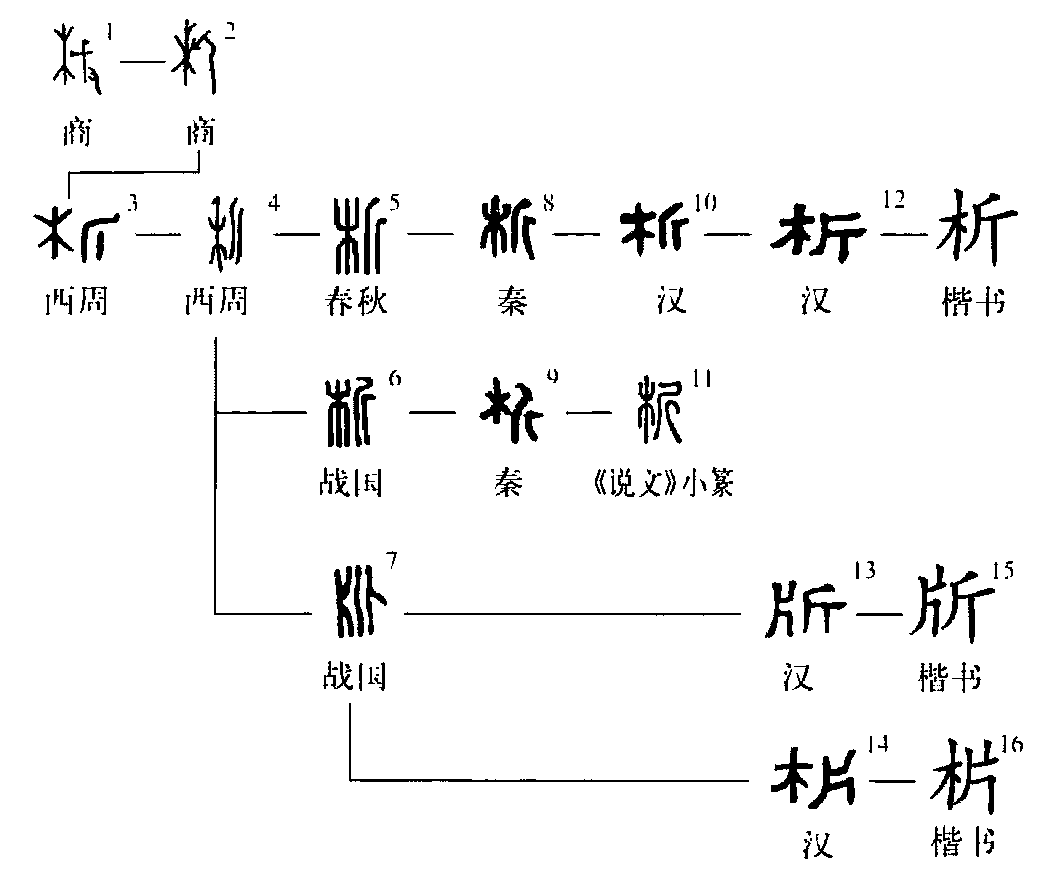 會(huì )意字。商代金文(字形1)像手持斧破木之形;甲骨文(字形2)省去手形,又用較常見(jiàn)的“斤”字替代了像斧形的部分(斧、斤是同類(lèi)的工具。參見(jiàn)斤部“斤”字條)。西周文字從木、從斤。春秋文字(字形4)“木”旁訛為“禾”。戰國文字(字形5)承襲商周文字,從木、從斤,為秦漢及后世文字所本;字形6“斤”旁上部彎曲,為秦代隸書(shū)或體及《說(shuō)文》小篆所本;字形7改從“木”為從“片”(像破開(kāi)之半木形),取意相同,為漢代隸書(shū)或體所本。受這種寫(xiě)法的影響,漢代隸書(shū)中還出現了從“木”從“片”的俗體。“析”,本義是劈開(kāi)(木頭)。《說(shuō)文》:“析,破木也。” 《廣韻·錫韻》:“析,字從木、斤。?,俗。”《集韻·錫韻》:“析,或從片,古作版。”《詩(shī)·齊風(fēng)·南山》:“析薪如之何? 匪斧不克。”漢王充《論衡·量知》:“斷木為槧,?之為板,力加刮削,乃成奏牘。”引申指分開(kāi),分散。《廣韻·錫韻》:“析,分也。”《書(shū)·盤(pán)庚下》:“今我民用蕩析離居,罔有定極。”成語(yǔ)有“分崩離析”。又引申指分析,剖析。晉陶潛《移居》二首之一:“奇文共欣賞,疑義相與析。”(冀小軍)