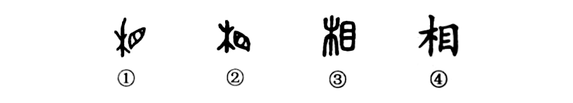 這是個(gè)“相”字。甲骨文①的左邊是“木”(樹(shù)),右邊是“目”(眼睛),用“目”看樹(shù)木就是“相”的本義。所以“相”字是個(gè)會(huì )意字。②是金文的形體,與甲骨文的形體基本相同,只是筆畫(huà)變粗了一些。小篆③與甲骨文的形體相類(lèi)似。④是楷書(shū)的寫(xiě)法。