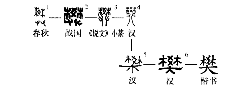 “久在樊籠里,復得返自然。”這個(gè)“樊”字本為會(huì )意兼形聲的字。①是金文的形體,上部為籬笆之形,下部是一雙手,表示雙手編織籬笆。該字的上部既表意也表音。②是小篆的形體,省掉了兩只手,頗像園圃周?chē)幕h笆的樣子。③也是小篆的形體,由金文演變而來(lái)。④是楷書(shū)的寫(xiě)法。