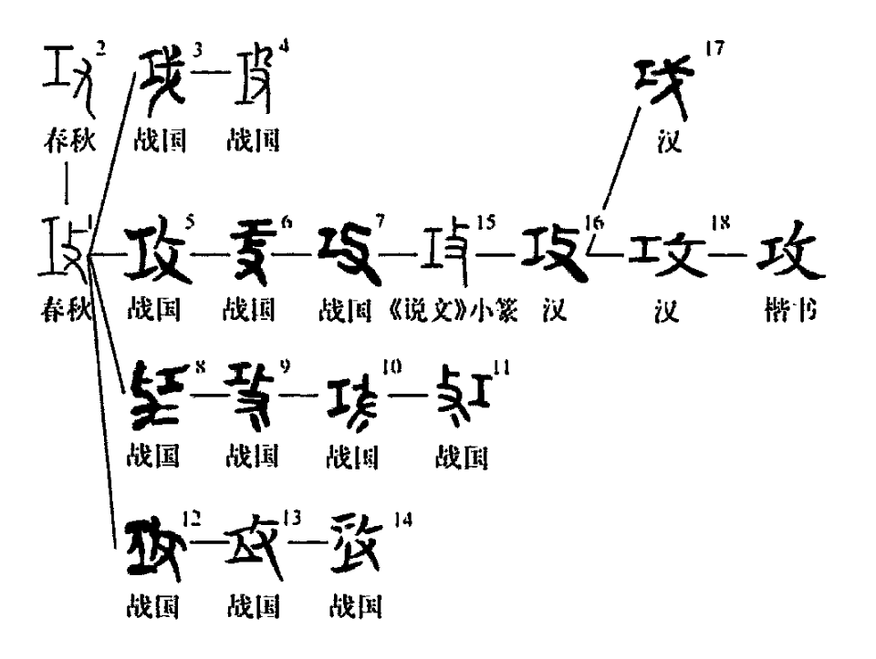 形聲字。從攴,工聲。形旁攴為手持械具以擊狀,表示攻的本義與擊打有關(guān)。聲旁工蓋為矩形,于攻表音,工與攻并見(jiàn)紐東部。源頭、聲首與初文是工,商周甲骨文、金文已見(jiàn)。古初以工為攻,后乃為造專(zhuān)字。《石鼓文》“