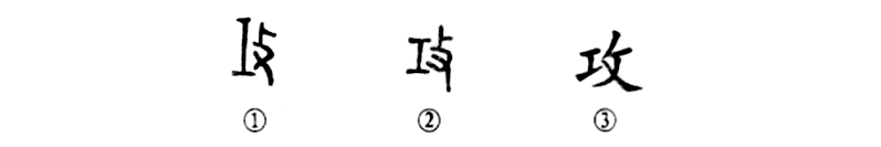 這是“攻城不畏堅”的“攻”字。①是金文的形體,其左是個(gè)“工”字,其右是個(gè)“攴”字;“攴”字的本身就有攻打的意思,所以“攻”字是一個(gè)左聲右形的形聲字,其本義就是攻擊(或攻打)。②是小篆的寫(xiě)法,其形體與金文基本相似。但是到了楷書(shū)③就大變樣了,表意的“攴”旁變成了“攵”(反文旁)。照形聲字的結構原則說(shuō),“文”字的意義與“攻擊”的意義沒(méi)有什么聯(lián)系,所以這種變法最初是變錯了,后來(lái)人們在書(shū)寫(xiě)時(shí)也就將錯就錯,以至于約定俗成了。