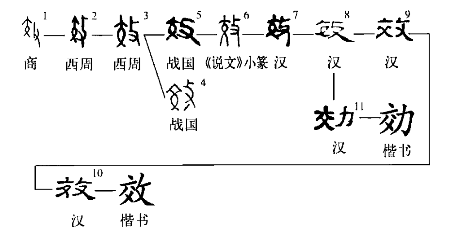 ,結果“又”成為上攴下寸的共用體。隸變后楷書(shū)筆勢化作效,支流變化作効?,F代整理漢字時(shí),效為規范正體。本義蓋為訓誡、教誨。毛公鼎:“善效乃友正。”(好好教誨與你一樣的德正者)引申指效法(此《說(shuō)文》本義)。《易·系辭上》:“天地變化,圣人效之。”又引申指效驗、檢驗。秦簡(jiǎn)中的“效律”就是查驗官府物資財產(chǎn)的法律。云夢(mèng)秦簡(jiǎn)《效律》:“嗇夫免而效,效者見(jiàn)其封及隄(題)以效之。”通“交”,交納。《禮記·曲禮上》:“效馬效羊者右牽之。”清朱駿聲《說(shuō)文通訓定聲》讀為“交”。甲骨文、金文用作人名。《小屯·殷虛文字乙編》5323:“叀子效令西。”(讓子效往西去)效尊:“效不敢不萬(wàn)年夙夜奔走揚公休。”(稱(chēng)揚公之美)(張標)