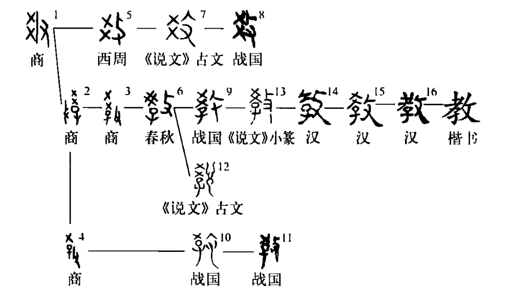 形聲字。商代甲骨文初作從攴,爻聲。形旁攴為手持器械施教形,表示教的本義與施教有關(guān)。聲旁爻像器物交織形,于教字表音,爻與??(教)并為宵部。后蓋為突出教育兒童義,復加表意偏旁子,遂為從攴從子爻聲之教。商代的??經(jīng)歷西周、戰國到漢代始終存在,但不被《說(shuō)文》收錄。主流體教字出現后商代出現爻省聲的異體