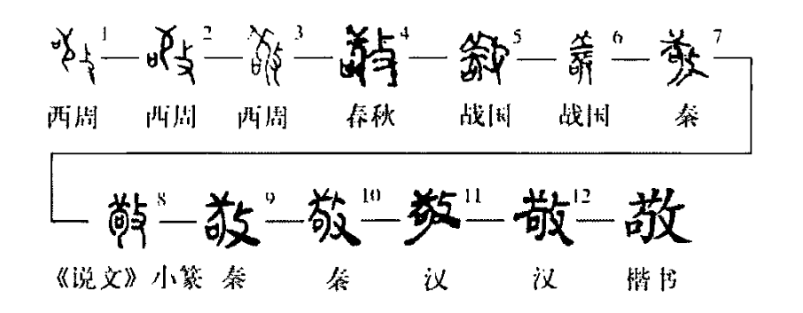 形聲字。《說(shuō)文》:“敬,肅也,從攴茍。”徐灝段注箋:“《釋名》曰:‘敬,警也,恒自肅警也。’按敬有戒謹義,茍訓急敕,敕者,戒也。其義相近,聲也相轉,疑即古敬字,從茍加攴,支,治也,治事肅恭之意。”西周早期金文以茍為敬,敬字是在西周早中期之間產(chǎn)生的,是在茍字基礎上累加義符而成,作為表示肅敬之義的專(zhuān)字。西周金文中敬字多用為嚴肅、肅敬之義,如叔?父卣銘文:“敬