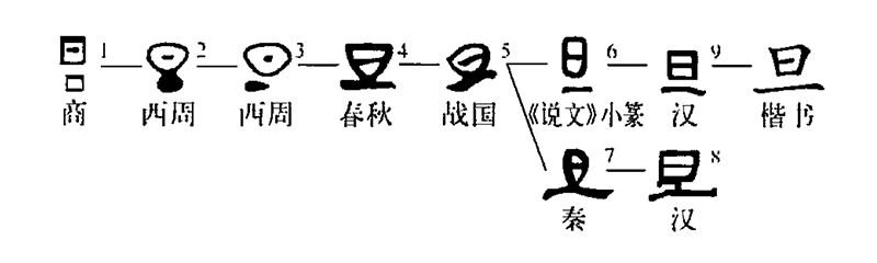 指事字。初文像太陽(yáng)破土而出之形,“日”下面像土地之意,填實(shí)與勾勒意同。至戰國文字時(shí),“土”又訛變?yōu)?ldquo;一”,小篆的字形就是由此而來(lái)。甲骨文:“……旦至于昏不雨。大吉。” (《合集》29272) 《說(shuō)文》:“旦,明也。從日見(jiàn)一上。一,地也。”所以“旦”字的本義就是“日方出”,也即“早晨”、“破曉”之義,并由此引申出“光明”、“白晝”、“一日之始”等意義。(王志平)