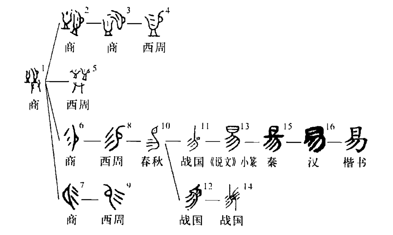 會(huì )意字。像雙手持器(有鋬)向另一器(無(wú)鋬)傾注液體之形。該字構形的發(fā)展可以分為繁簡(jiǎn)二系。繁系包括1-5各形,其通行時(shí)間為商代到西周,其中2(省去雙手形)、3(省去雙手形及有鋬器之圈足形)、4(省去雙手形及無(wú)鋬器形)各形是1逐步簡(jiǎn)化的結果,而5則是1的直接繼承,只是雙手的位置放在兩器的正下方,與初文放在有柄之器下者有所不同。簡(jiǎn)系包括6-12各形,其存在時(shí)間為商代至今。其中6或7形應看成由4形所代表的有柄之器經(jīng)過(guò)截除性簡(jiǎn)化而形成的,即截取器形中靠近鋬的部分和器中的液體,而省去其他部分。12則是簡(jiǎn)系中為追求美觀(guān)而有意繁化的結果。易字本義當為傾注(此義不見(jiàn)于文獻,而表示注水器的匜字可能是其同源詞),引申為賜予,后代一般用賜(賜)記錄這個(gè)意義。旅鼎:“公易(賜)旅貝十朋。”臣卿鼎:“臣卿易(賜)金。”《商君書(shū)·錯法》:“夫離朱見(jiàn)秋豪百步之外,而不能以明目易人;烏獲舉千鈞之重,而不能以多力易人。”又引申為更易。甲骨文常見(jiàn)“易日”一語(yǔ)。《易·系辭下》:“上古穴居而野處,后世圣人易之以宮室。”文獻中常見(jiàn)的“難易”之“易”,應該看成借字(無(wú)本字)。(孟蓬生)