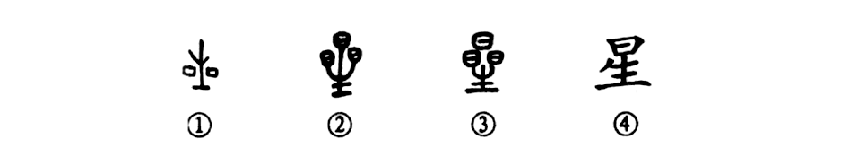 ,明雨,伐? 既雨。咸伐,亦雨? 施卯鳥(niǎo)星(晴)。” (《合集》11497正)金文作“曐”。從晶,生聲。戰國文字或作“星”字。《說(shuō)文》:“曐,萬(wàn)物之精,上為列星。從晶,生聲。一曰象形。從口,古口復注中,故與日同。”所說(shuō)的“一曰”云云,顯然有誤。所以“星”本指群星,后也指單獨的星體。古代所說(shuō)的“星”,包括今天所說(shuō)的“恒星”、“行星”、“流星”、“彗星”等等。后也引申指“小的斑點(diǎn)”等等。今簡(jiǎn)化為“星”。(王志平)